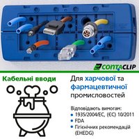 Завдяки гігієнічноим кабельним вводам від CONTA-CLIP, кілька електричних кабелів – зі з'єднувачами (накінечниками) або без них – а також пневматичні та гідравлічні шланги можна швидко та легко підводити до шаф керування, корпусів або машин, економлячи місце та захищаючи їх до IP66 (сертифіковано відповідно до DIN EN 60529). Наші кабельні вводи сигнального синього кольору в основному використовуються в харчовій промисловості та пакуванні, де немає прямого контакту з їжею, а також у фармацевтичному секторі.