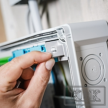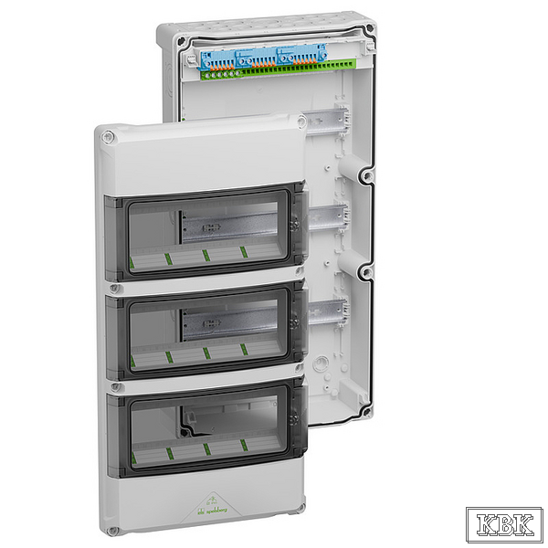 AK Kompakt — це більше, ніж просто компактний розподільний щит з рівнем захисту ІР65, це ідеальне рішення для стандартних внутрішніх установок з 2-ма чи 3-ма рядами. Вона була розроблена для монтажників, з деталями, які помітно спрощують щоденну роботу. До них належать вбудована клема PE/N, введення кабелю без інструментів та простий монтаж на DIN-рейку без додаткових інструментів.