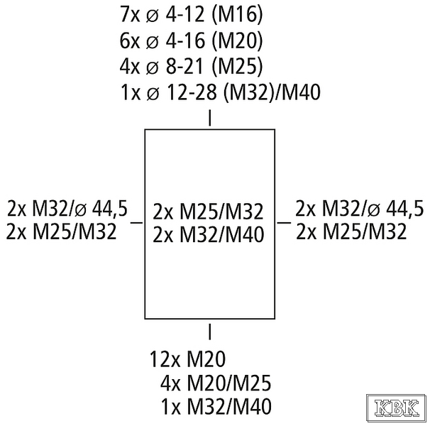 Введення кабелю без інструментів: Вісімнадцять м’яких мембран забезпечують швидке та легке введення кабелю, повністю без інструментів. Деякі з м’яких мембран також підходять для використання з кабельними сальниками. Протилежна сторона оснащена метричними вибивними отворами для кабельних сальників та подвійних мембранних з'єднувачів, що дозволяє гнучко адаптувати монтаж завдяки повороту коробки на 180°.