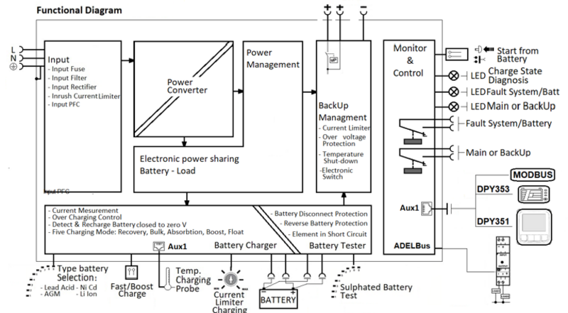 DC-UPS від ADELSystem це унікальникй пристрій "Все-в-одному блоці", який містить: Блок живлення, Модуль Back Up, Зарядний пристрій та Модуль Керування Живленням (Power Management Module - PMM). PMM - це автоматичний розподіл потужності між навантаженням та акумулятором.